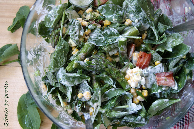 Składniki sosu mieszamy ze sobą i całość dodajemy do sałatki. Delikatnie mieszamy.
